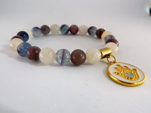 La main de Fatma (fabriquée en Europe – zamac doré sans nickel, cadmium ni plomb) n’est pas un symbole religieux. Elle est associée par les juifs, arabes et même hindous à un symbole de bon augure. Il nous a paru intéressant de composer ce bijou porteur d’espoir avec une amulette si positive. Nous pouvons, si vous le souhaitez, livrer le bracelet sans cet apprêt.