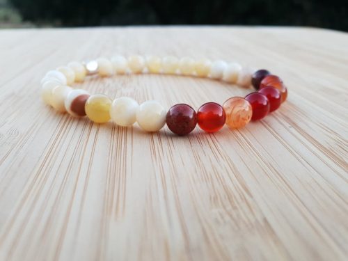 La couleur du chakra sacré est orange, mélange de rouge (couleur du chakra racine) et jaune (couleur du chakra du plexus solaire). Cette couleur est liée à l’enthousiasme, à la vitalité. Elle peut effacer des humeurs maussades, amener une énergie rayonnante… Comme notre bracelet !