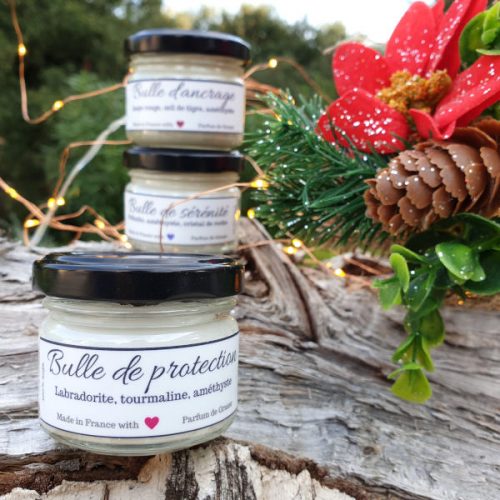 Vos bougies sont fabriquées en France en soja écologique, garanti sans OGM. Elles sont délicatement parfumées avec des parfums de Grasse, choisis pour résonner avec les bulles de bonheur : fleur de lotus pour la sérénité, synergie de plantes solaire pour l’amour et notes olfactives entre terre et air pour la chance.